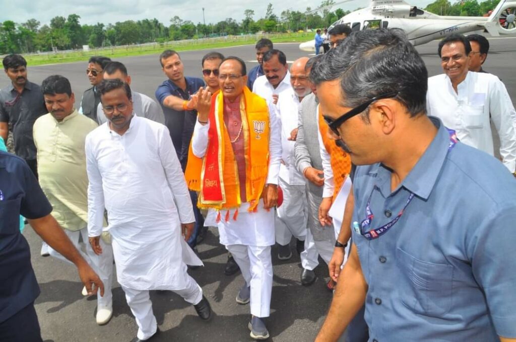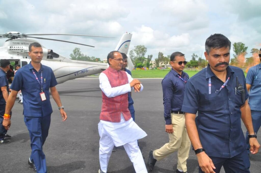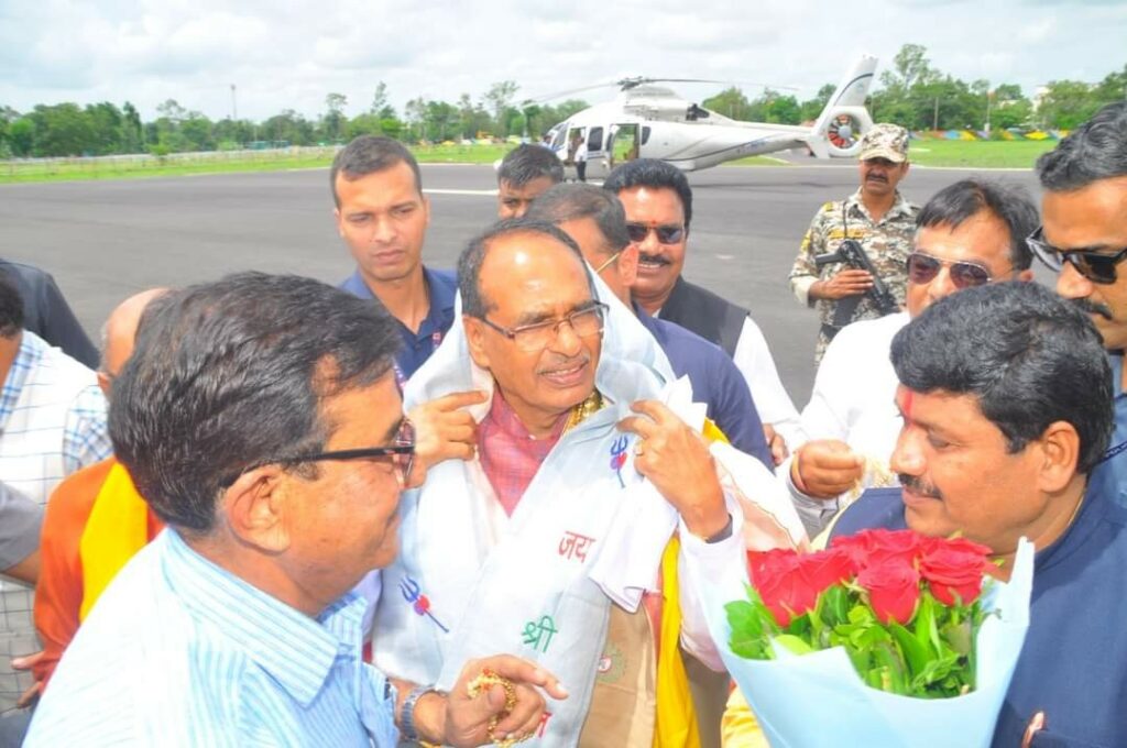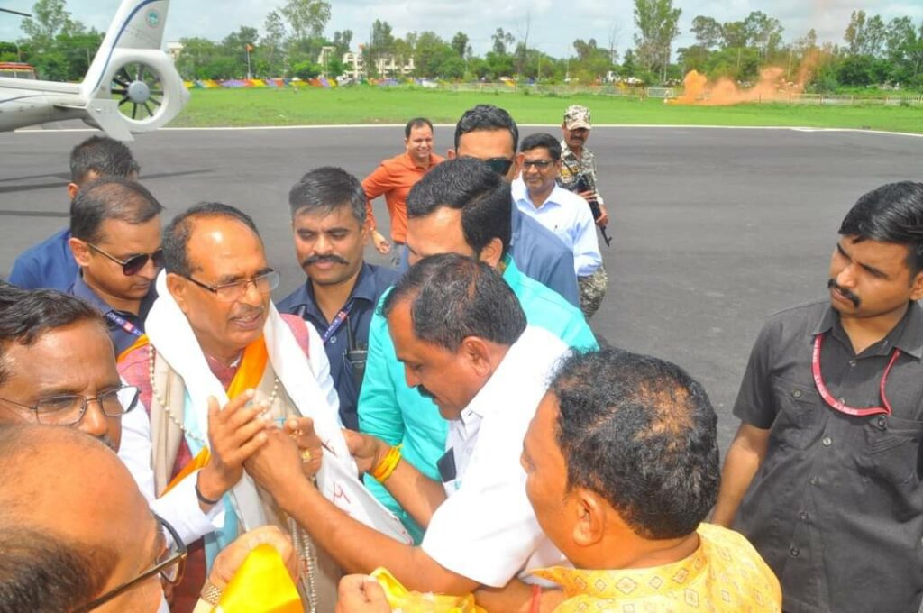 विवेक मालवीय – उज्जैन 24 जुलाई। मुख्यमंत्री श्री शिवराज सिंह चौहान सोमवार 24 जुलाई को दोपहर में पुलिस लाइन स्थित हेलीपेड पहुंचने पर प्रशासनिक अधिकारियों एवं जनप्रतिनिधियों ने अगवानी कर स्वागत किया। मुख्यमंत्री श्री चौहान के साथ उनकी धर्मपत्नी श्रीमती साधना सिंह, पुत्रद्वय आये। हेलीपेड पर संभागायुक्त श्री संदीप यादव, आईजी श्री संतोष कुमार सिंह, कलेक्टर श्री कुमार पुरुषोत्तम, पुलिस अधीक्षक श्री सचिन शर्मा, नगर निगम आयुक्त श्री रोशन सिंह, सांसद श्री अनिल फिरोजिया, विधायक श्री पारस जैन, श्री बहादुर सिंह चौहान, महापौर श्री मुकेश टटवाल, यूडीए अध्यक्ष श्री श्याम बंसल, श्री विवेक जोशी, श्री बहादुर सिंह बोरमुंडला, पूर्व सांसद श्री चिन्तामणि मालवीय, पूर्व विधायक श्री सतीश मालवीय, श्री ताराचन्द गोयल, श्री रोड़मल राठौर, श्री जगदीश अग्रवाल, श्री विशाल राजौरिया, श्री अनिल जैन कालूहेड़ा, श्री राजपाल सिंह सिसौदिया, श्री वीरेन्द्र कावड़िया, पूर्व नगर निगम सभापति श्री सोनू गेहलोत आदि उपस्थित थे।