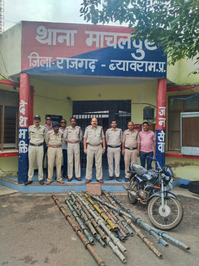 विवेक मालवीय जिला ब्यूरो चीफ राजगढ़ – जिले में सम्पत्ति संबंधी अपराधों को रोकने हेतू वरिष्ठ पुलिस अधीक्षक राजगढ श्री बीरेंद्र कुमार सिंह (भापुसे) के कुशल निर्देशन मे अतिरिक्त पुलिस अधीक्षक राजगढ श्री मनकामना प्रसाद व एसडीओपी खिलचीपुर श्री आनंद राय के द्वारा निर्देशित किया जा रहा है उक्ति कुशल निर्देशन के पालन में दिनांक 26.07. 23 को फरियादी सूरज पिता अनिल मेवाड़ा निवासी जीरापुर की रिपोर्ट पर थाना माचलपुर में अपराध कायम कर विवेचना में लिया गया था  दौरान विवेचना दिनांक 27.07.2023 को विश्वनीय मुखबीर द्वारा सुचना हुई की पुलिया के पास गोघटपुर रोड किनारे दो व्यक्ति नाली में लोहे के पाइप छुपा रहे हैं मुखबिर की सूचना पर रवाना होकर पुलिया के पास नाली के यहां  गोघटपूर पहुंचे दो व्यक्ति नाली में लोहे के पाइप जमीन में गड़ा कर छुपा रहे थे जिनको घेराबंदी कर पकड़ा जिन से नाम पता पूछा तो अपना नाम उदयराम गुर्जर 24 साल निवासी खेड़ी गौतमपुरा तथा कमल  वर्मा 25 साल निवासी कुंडीखेड़ा होना बताएं जीनसे पूछताछ करने पर दिनांक 19.07.23 को रात्रि में भारूगढ़ जोड़ के पास बने टीन के सेट के अंदर से लोहे के 19 नग को चोरी करना स्वीकार किया गया बाद आरोपी गणों से पूछताछ कर घटना में चोरी किया गया 19 नग पाइप  एवम मोटर साइकिल  RJ-20 SK-3706  कुल मसरूका कीमती 87000 रूपए को जप्त किया गया बाद आरोपी गणों को गिरफ्तार किया गया एवं आरोपीगणों को माननीय न्यायालय पेश किया गया है ।