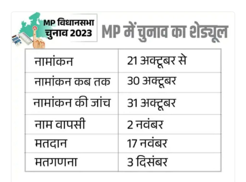 मध्यप्रदेश में दिवाली के 5 दिन बाद मतदान होगा। प्रदेश की सभी 230 सीटों पर एक ही फेज में 17 नवंबर को वोट डाले जाएंगे। इसके 16 दिन बाद 3 दिसंबर को नतीजे आएंगे।